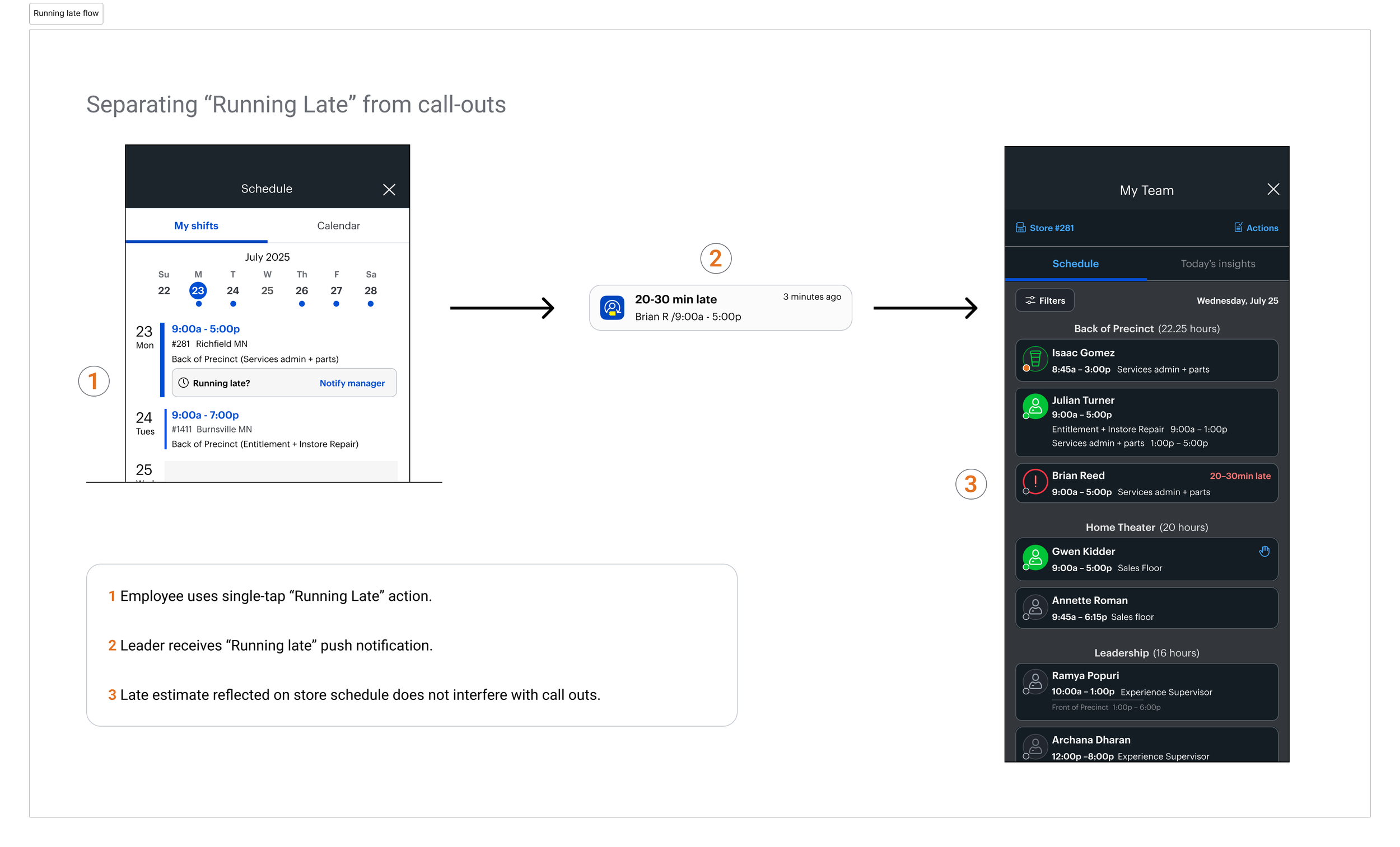 • Created a dedicated “Running Late” action on employee’s shifts. The action was placed directly on the shift to reduce friction during time-sensitive moments.