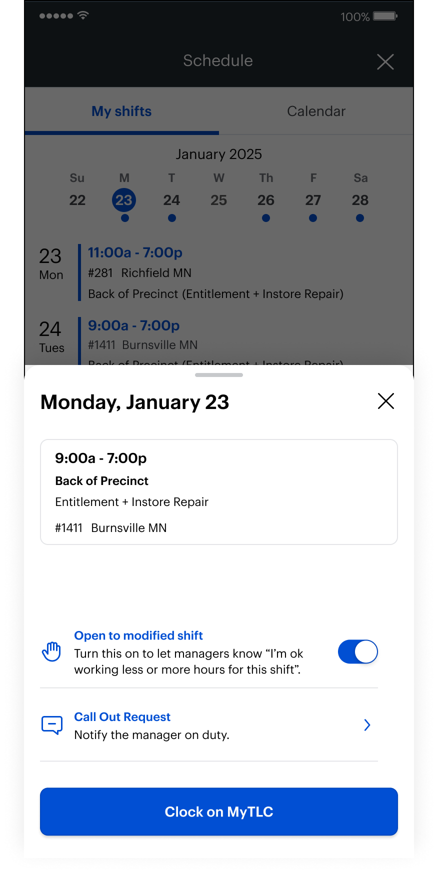 Inspired by the whiteboard, we explored a simple opt-in signal that employees could toggle via their shift in Schedule tool.